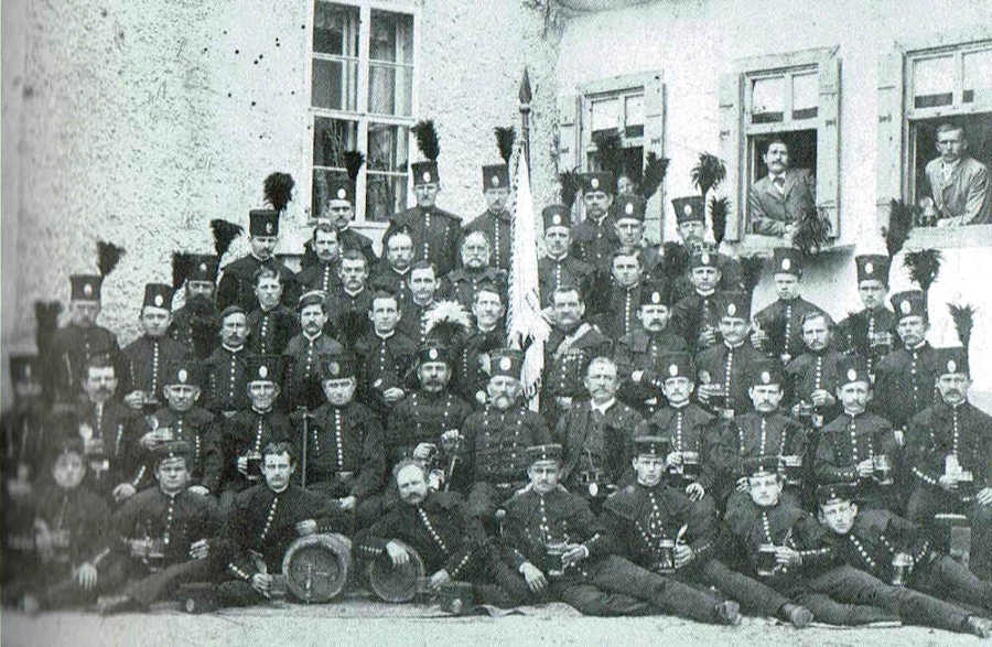 Die Mitglieder des Bergmanns-Vereins Dölau mit der Vereinsfahne vor der Gaststätte „Dölauer Heide“ um 1900 2)
