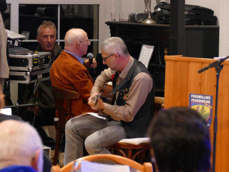Oben rechts:Eröffnung der Veranstaltung durch Dr. Jörg-Thomas WissenbachRechts Mitte:Blick in den ZuschauerraumRechts unten:Volker Räthe und Johannes Knackstedt beim SchlußliedLinks:Fotos von Orden und Auszeichnungen Dölauer Einwohner